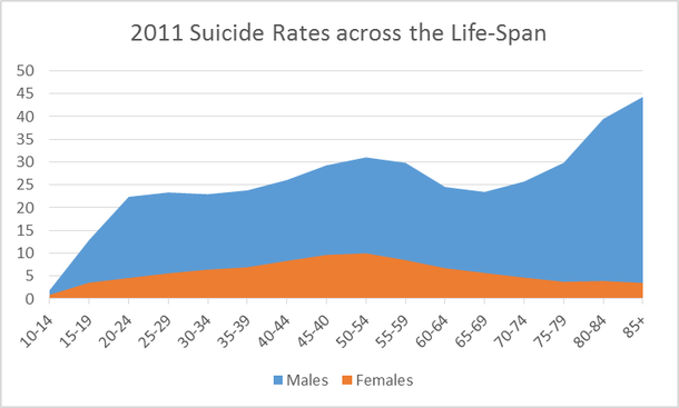 Another example is the issue of suicide where males are 80% of all completed suicides. (Chart above: rates are per 100,000 population from CDC WISQARS system.) Incredibly this 80% fact is rarely mentioned in the media leaving most people unaware that the biggest risk factor in suicide is being male. It is not surprising that females get the majority of attention around suicide both clinically and in research. This even though men are the vast majority of those needing help. In 2009 the National Association of Social Workers (NASW) did some research on suicide. I was shocked to see it was a study on girls! I wrote to then NASW Director Elizabeth Clark and asked why the research focused on girls when it was men and boys who were the vast majority of suicides. She wrote me back and said that the funder for the research had specified to only study girls. Just imagine for a moment someone who funded research for Sickle Cell Disease but stipulated the research had to be on whites. Can you imagine the outrage? Blacks are 60-80% of those with Sickle Cell disease and to study only whites would be seen as totally racist but somehow studying only girls and suicide is okay. That is gynocentrism.